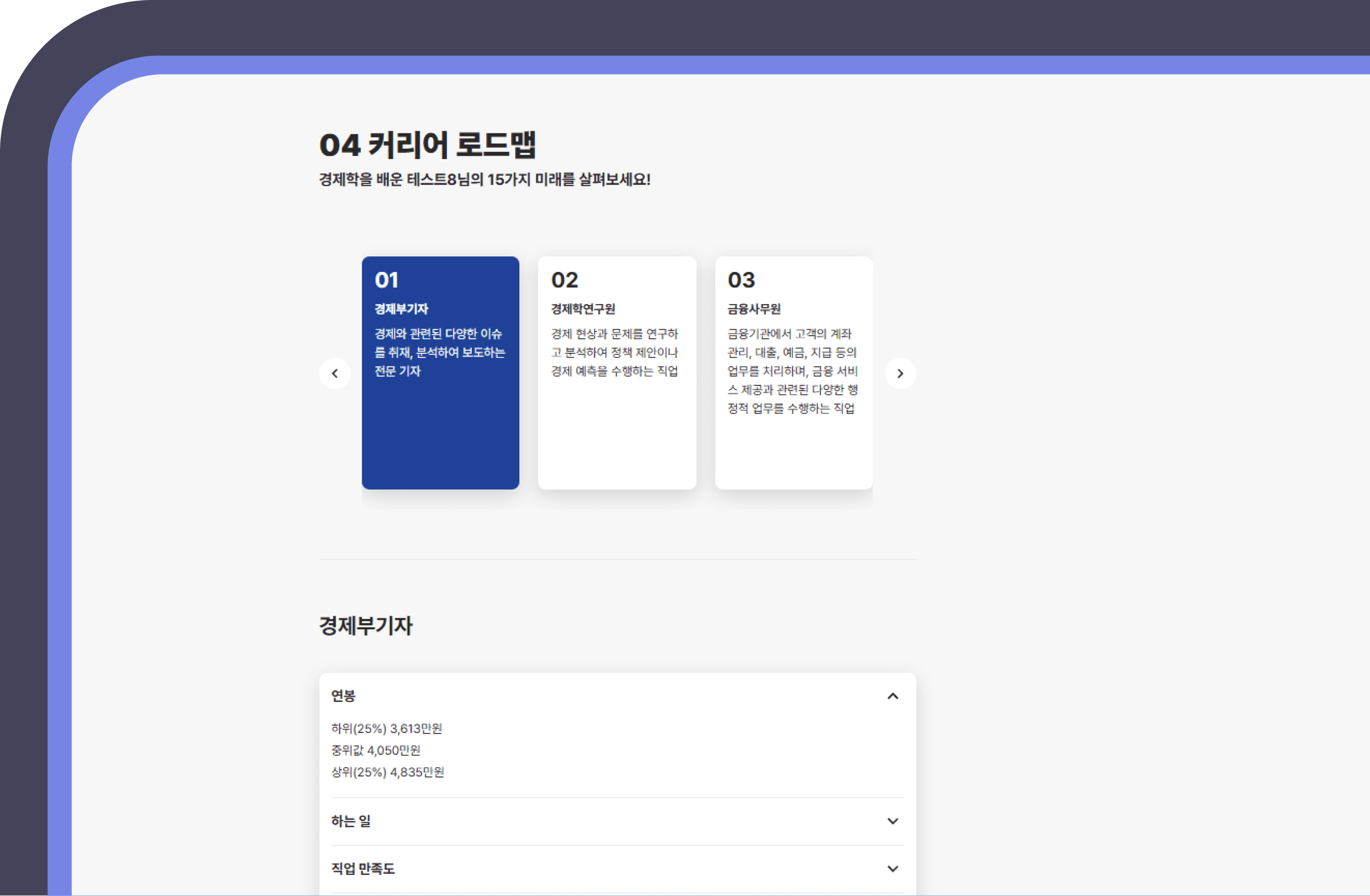 전공 적성뿐만 아니라, 앞으로 펼쳐질 미래의 모습을 구체적으로 계획할 수 있도록 직업별 연봉정보, 직업 만족도 등 다양한 직업정보와 경력 개발 방법 등도 알려드릴게요